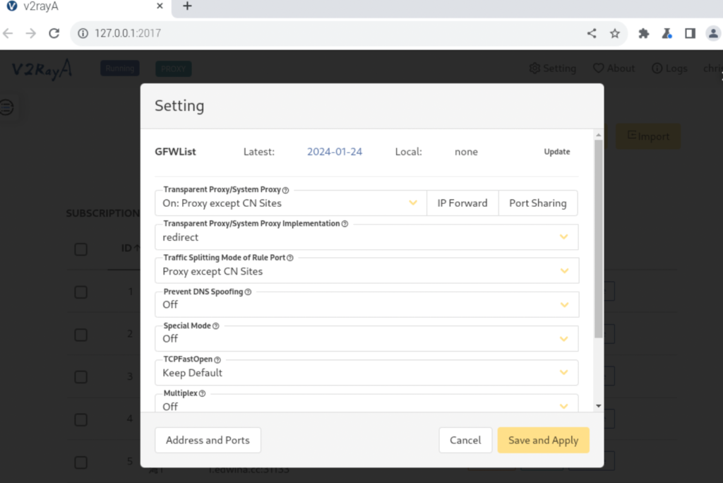 访问  http://localhost:2017 进入web配置界面,设置一个管理员账号和密码,导入代理,成功后返回第一步,设置系统代理,并返回第一步 respi-config 菜单改变系统代理为下方 “Address and port“ 中指定的本机地址。